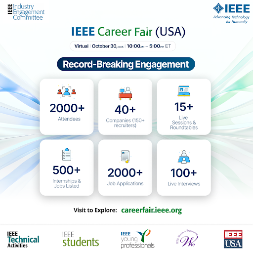 In October, the IEEE Industry Engagement Committee (EIC) and IEEE Technical Activities (TA), through the TAB Committee on Technical Community Outreach, Engagement, and Society Membership, came together to co-host the first-ever nationwide IEEE Virtual Career Fair (USA) — a landmark example of what collaboration across IEEE can achieve. The event brought together IEEE-USA, IEEE Member and Geographic Activities, IEEE Students, IEEE Young Professionals, IEEE Women in Engineering, and multiple Societies, including IEEE Power & Energy Society, IEEE Industry Applications Society, and IEEE Signal Processing Society.